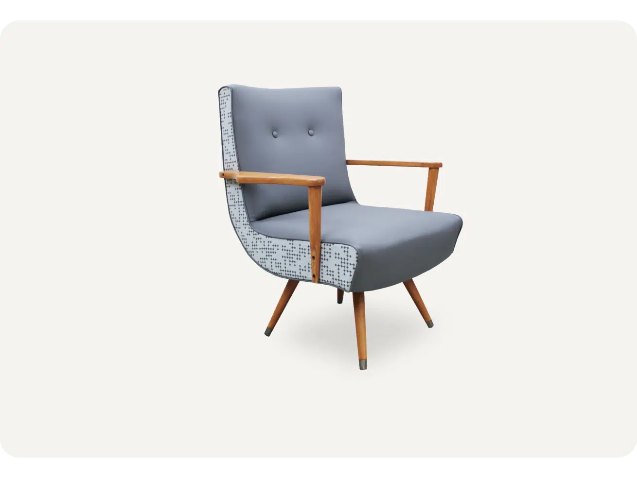 Fauteuil berçant rotatif des années 50 remis à neuf et rembourré selon les choix et préférences des clients.