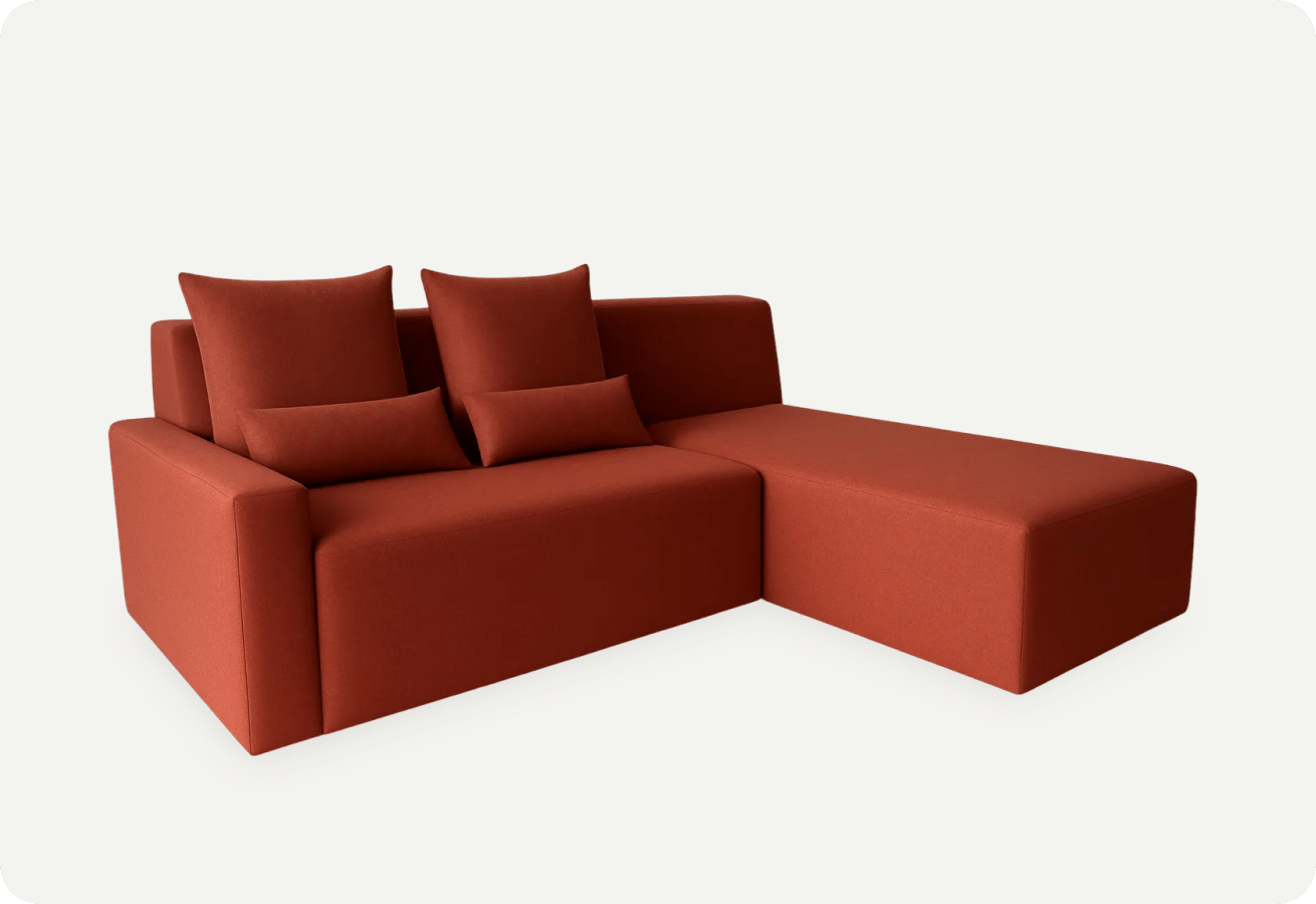 Ce meuble ne devrait pas exister, pourtant il est le parfait élément après avoir été récupéré d’un démonstrateur ayant servi à teste un confort pour un autre projet. Il a été ensuite complété par un appui-bras et un dossier à la partie chaise-longue pour créer un sofa modulaire sur mesure